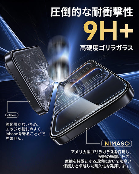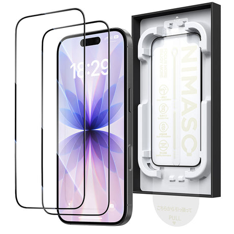 NIMASO iPhone 17/Pro/Pro Max/Air用 【バリ楽Box】 強化ガラスフィルム 全面保護 黒縁あり 自動除塵ガイド枠付き【2枚】