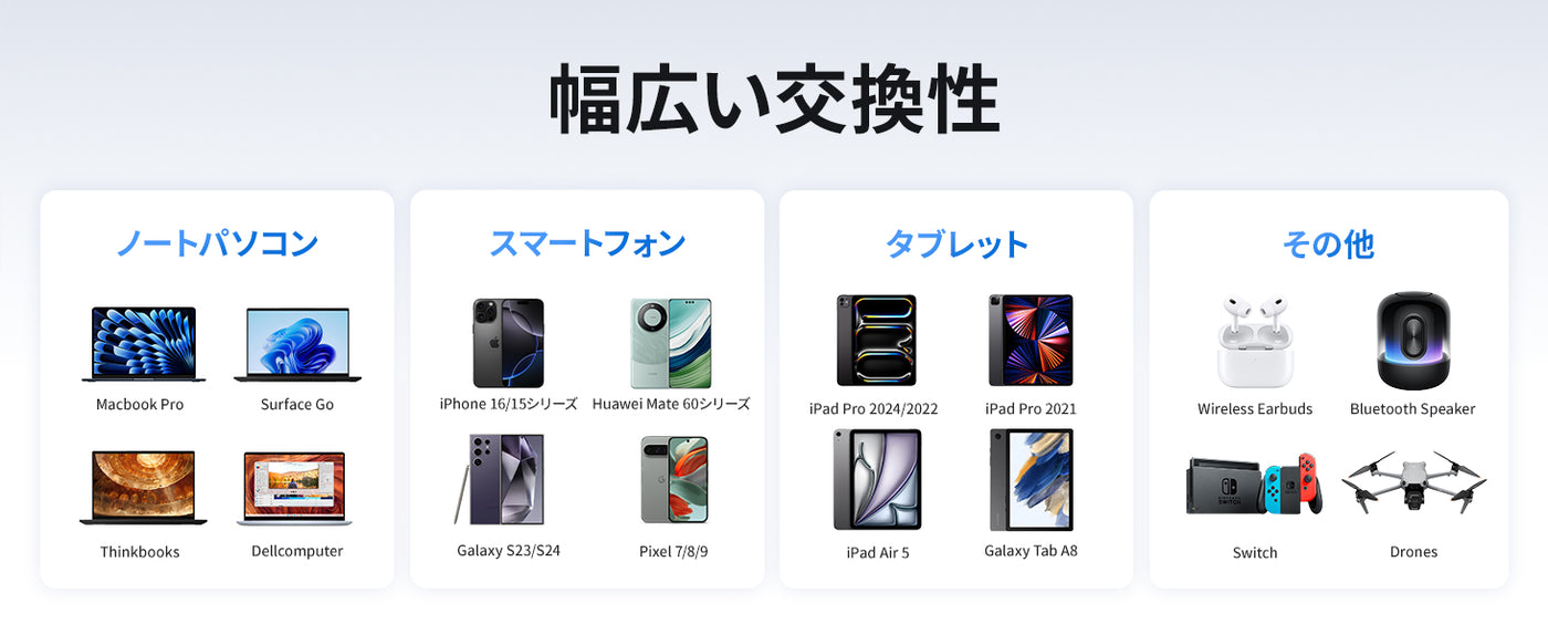 すべてのUSB C-USB Cデバイスと互換性がある【映像出力は非対応】 以下は一部対応機種の一覧: