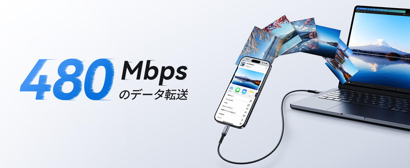 • 480Mbpsの高速データ転送は、音楽、映画、写真、HD動画をわずか何秒以内に転送できます。