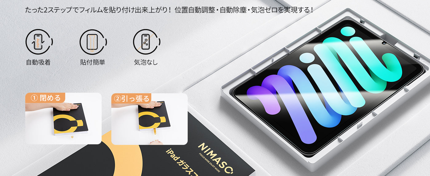 - [Easy Application for Anyone] NIMASO's latest design automatic dust removal kit allows for easy application with just a simple pull, without the need for any additional tools. The automatic dust removal kit is equipped with a precise positioning device that positions the film perfectly to fit the iPad mini 6/mini (A17 Pro) screen. This allows for automatic positioning during application, ensuring efficient and precise application. Even those who are not skilled at applying films can easily apply the film, making it "easy for anyone."