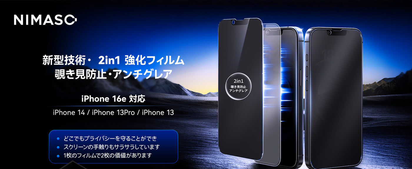 ![NIMASO iPhone 16e/14/13 Pro/13 2in1 Anti-Glare + Anti-Peep Tempered Glass Film "Bari-Raku Box" with Guide Frame [1 Sheet]](http://hwv05q-i1.myshopify.com/cdn/shop/files/iPhoneSE4-14-13Pro-13-film-B0DSP2M4NY-02.jpg?v=1756263073&width=1214)