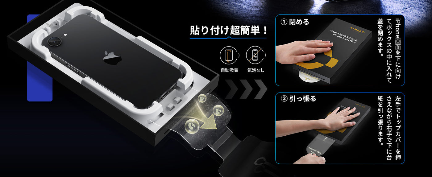 - [Easy-to-Apply Box - Anyone Can Apply It Easily] NIMASO's latest film application design allows you to apply the film simply by pulling the film with the Easily Applied Box. The Easily Applied Box is equipped with a precise positioning device that positions the film perfectly to fit the iPhone screen. Automatic dust removal during application makes application easy, even for those who are not good at applying films. This truly makes application "easy for anyone."