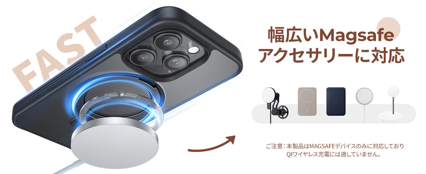 - 【MagSafe対応・強力な磁力吸着】iPhone 15 Pro専用。iPhone 15 Pro用 ケースは内部に38個の強力なN52マグネットを搭載しており、マグセーフ充電器やその他様々なマグセーフマグネットアクセサリーをしっかりと保持します。先進的な磁気吸引力技術により、移動中の車内でも簡単に落ちることはありません。また、急速充電可能です。 マグセーフアクセサリーとの完全な互換性があり、安心してお使いいただけます。 (注意:本製品はMagsafeデバイスのみに対応しており、QIワイヤレス充電には対応しておりません。ご購入前に必ずご確認下さい。)
