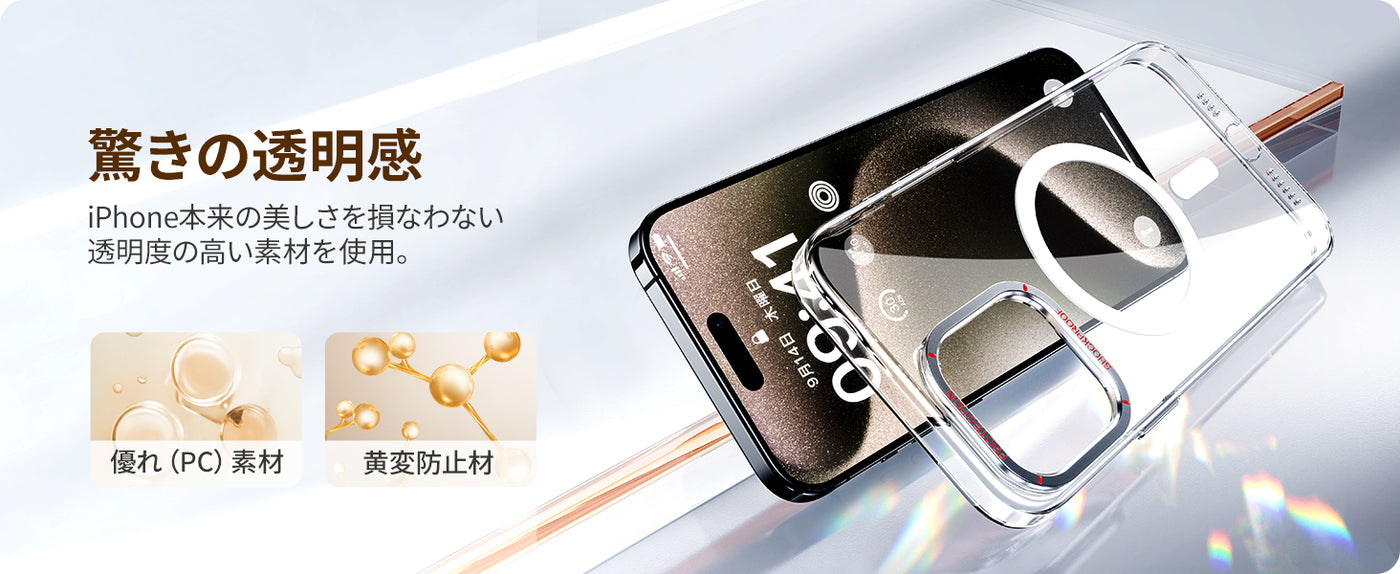 • 【極薄で透明&黄変なし】高透明度ポリカーボネート素材を採用、スマホ本来の崇高な美しさと色をそのままに生かし、iPhone本体の高級感にも劣らない美しさです。従来品より優れたポリカーボネート(PC)素材でクリアケースにありがちな変色劣化を徹底的に解消できます!ご注意:ポリカーボネート(PC)素材を採用しておりため、使用中にひび割れを防ぐため、鋭利なものや重いものをぶつけないようにする必要があります。