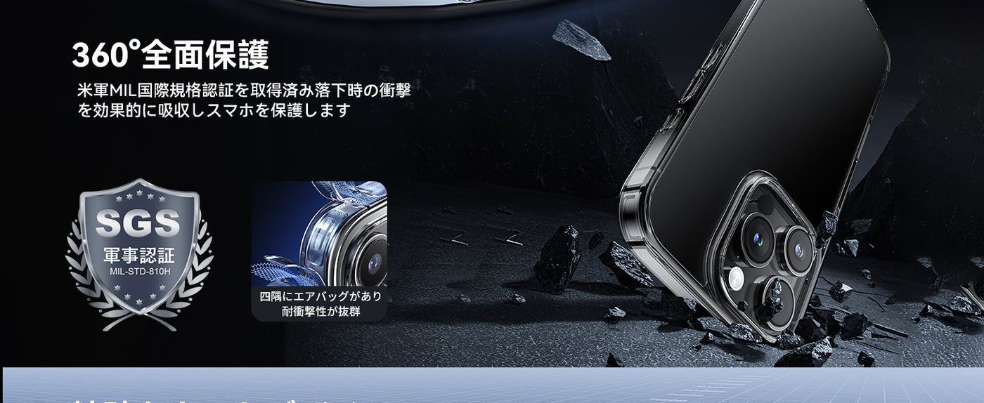 - 【米軍規格SGS認証・超強耐衝撃性】世界で有名な米国防総省が規定する米軍採用品規格「MIL-STD-810H」認証を取得済みです(認証番号:GZMR220802496801)。コンクリートの地面に厚さ5mmの合板を敷き、高さ1.2mから合計26回、違う角度から落下させる実験をしましたが、本体に傷はつきませんでした。四隅には高耐震クッションを搭載しており、高い耐衝撃性です。スマホを全方位からしっかりと守ります。