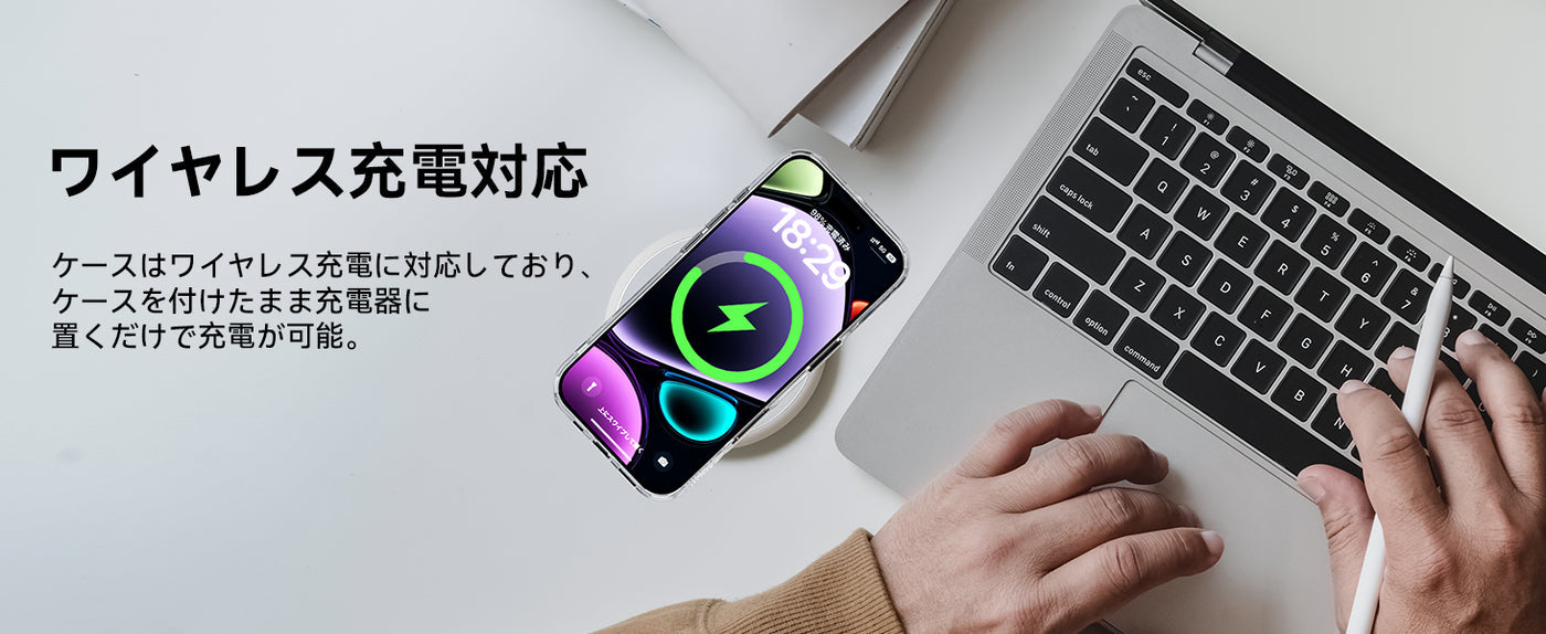 ▲ご確認下さい!!ケースを装着したままワイヤレス充電ができます。充電時にケースからはずす手間がありません。