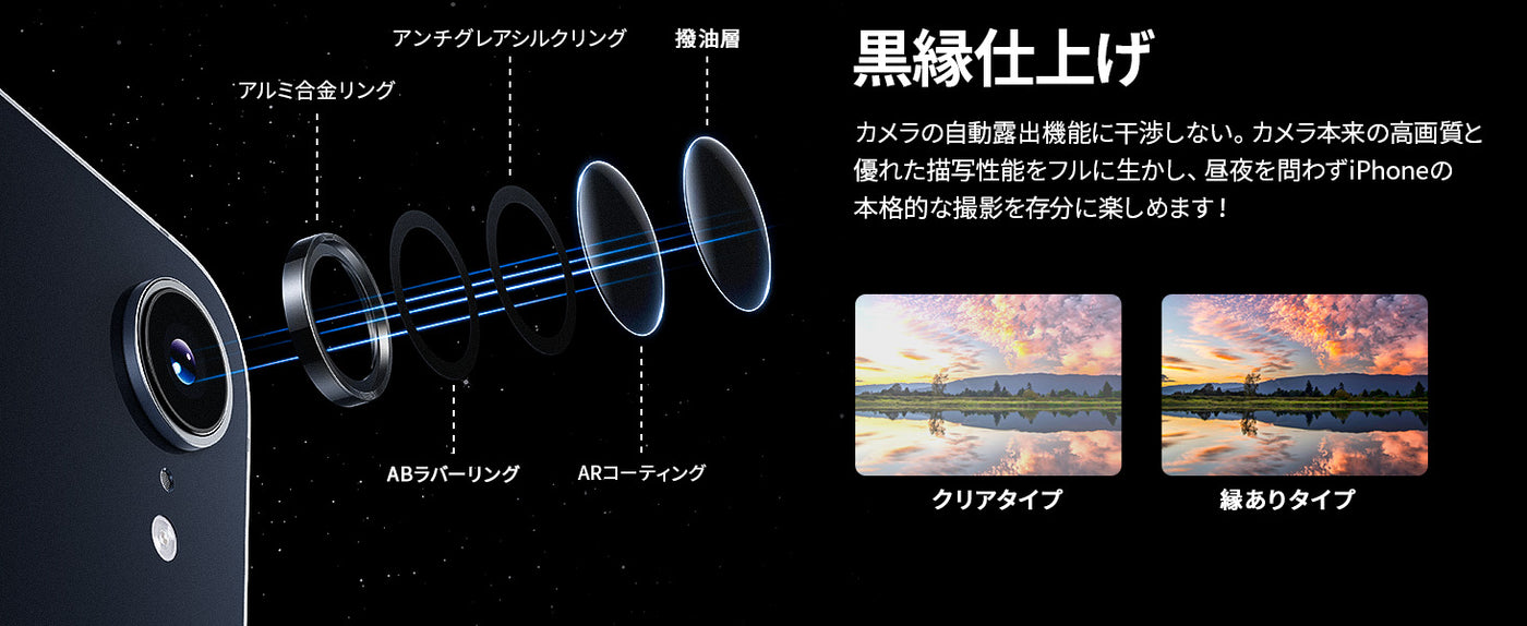 特徴 : アルミ合金リング、ARコーティング、高透過率、耐衝撃、9H強化ガラス、黒縁取り、露出オーバー防止、キズ防止、指紋防止、ケースと干渉しない、貼り付け簡単