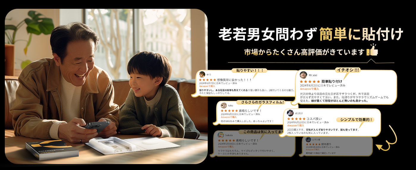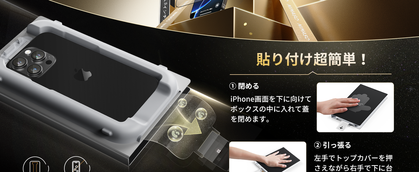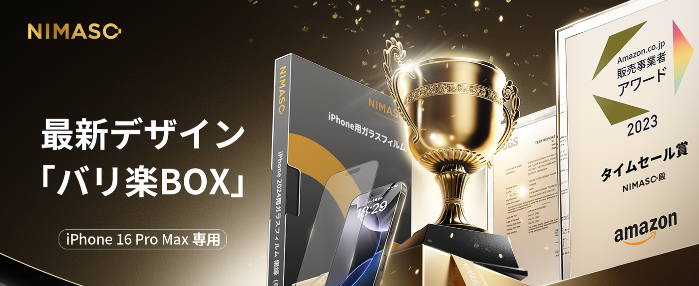 - 【バリ楽Box・誰でも簡単に貼れる】NIMASO最新のフィルム貼り付けデザインで、バリ楽Boxさえあれば、引っ張るだけで貼り付けが完了します。バリ楽Boxには正確な位置決め装置が搭載されており、iphone 16promaxの画面にぴったり合うようにフィルムが配置されています。貼り付け時に自動的に除塵が可能になり、フィルムを貼るのが苦手な方でも簡単にフィルムが貼ることができ、まさに、【誰でも簡単に貼れる】を実現しました。