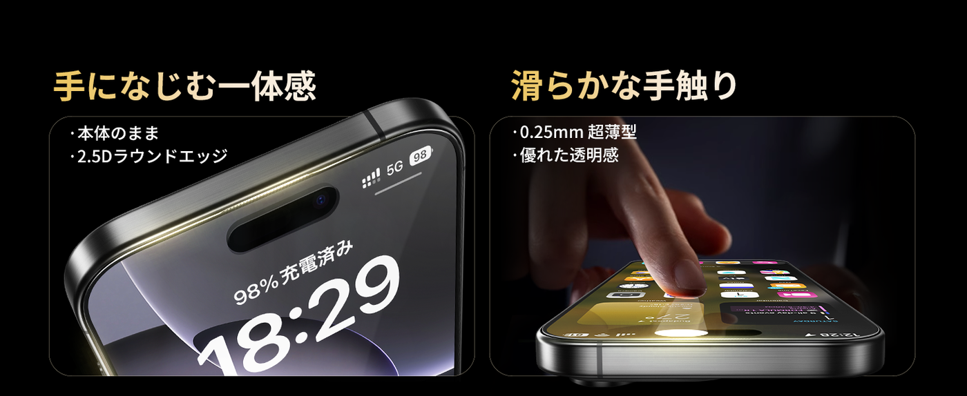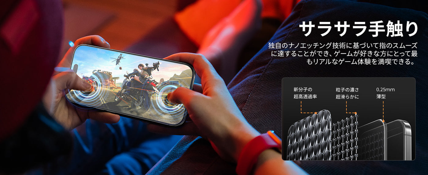 - 【サラサラ手触り・指紋防止】独自のナノエッチング技術に基づいて加工を施しており、一般的な強化ガラスと比べてよりさらさらとした質感で、究極のスムースタッチ感が実現できます。ゲーム好きな方にもおススメのフィルムです。撥水撥油のAF(Anti-Fingerprint)コーディング加工とスムースタッチ加工により、指紋が目立ちにくく、油分や水分が多く含む汚れや指紋がついても、拭き取るだけで綺麗になります。